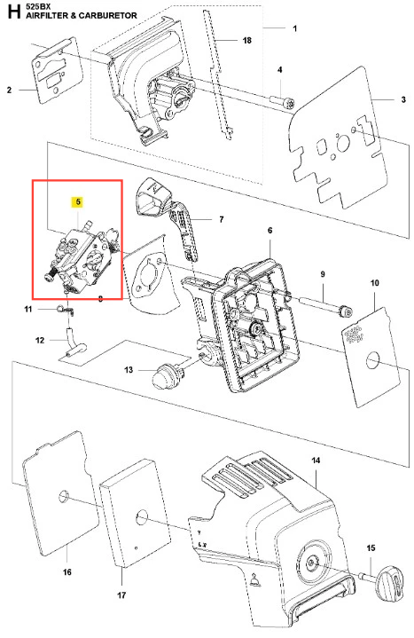 Gaźnik dmuchawy 525BX Husqvarna - wysokiej jakości oryginalna część producenta Husqvarna. Aktualny numer katalogowy produktu: 501716906. Szczegóły montażu dostępne w załączonym schemacie. Poniżej znajduje się lista modeli, w których ten element jest wykorzystywany.