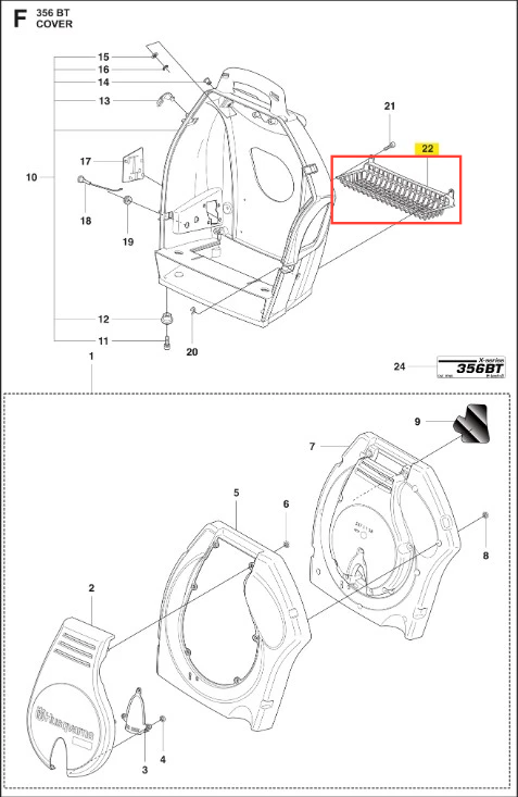 Grid dmuchawy 356BTx Husqvarna - wysokiej jakości oryginalna część producenta Husqvarna. Aktualny numer katalogowy produktu: 537193301. Szczegóły montażu dostępne w załączonym schemacie. Poniżej znajduje się lista modeli, w których ten element jest wykorzystywany.
