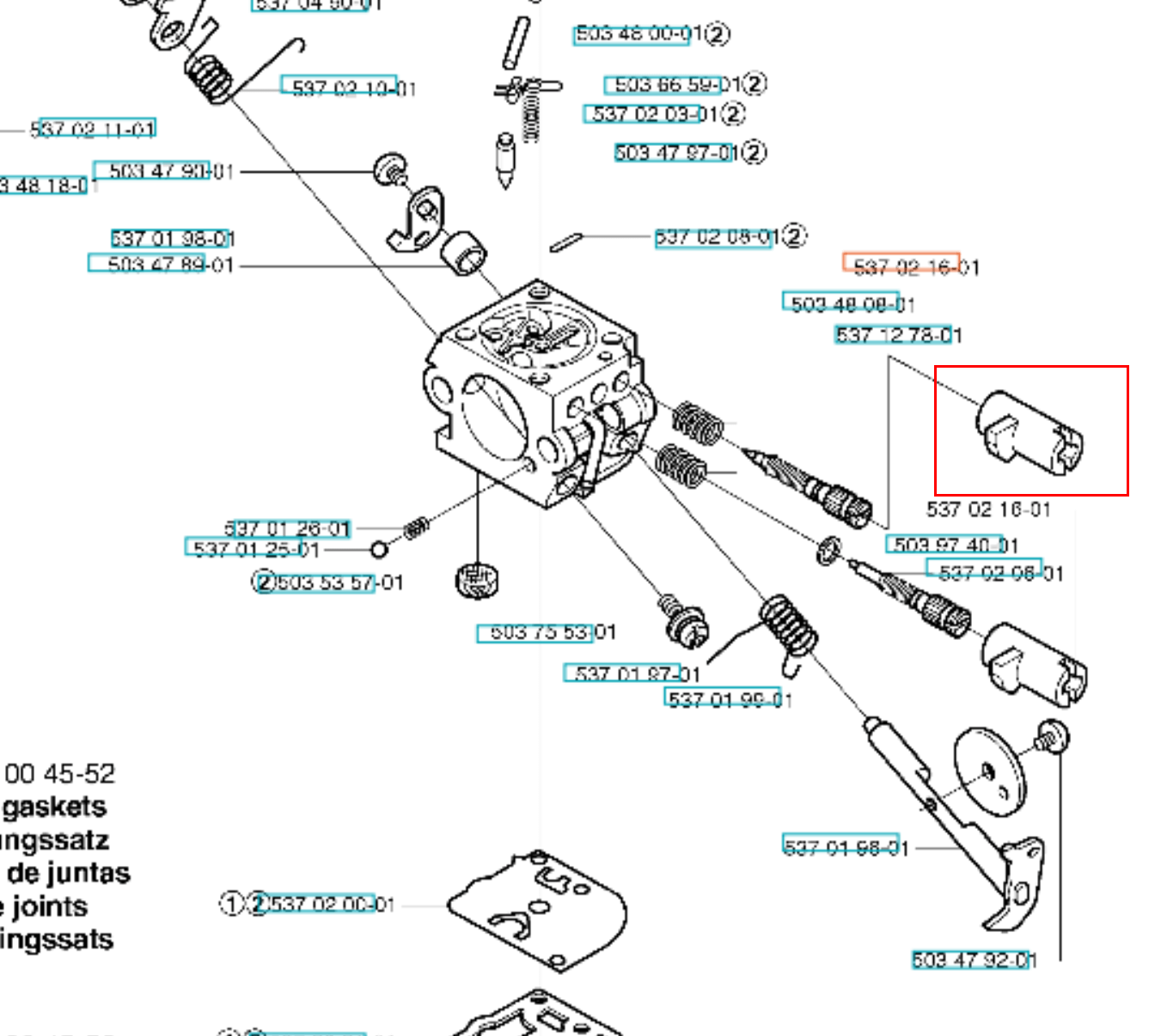 Nakrętka gaźnika dedykowana do wykaszarek Husqvarna numer katalogowy 537021601. Produkt występuje pod numerem katalogowym: 546444201. Dokładne umiejscowienie gaźnika widoczne na załączonym schemacie. Producent Husqvarna.