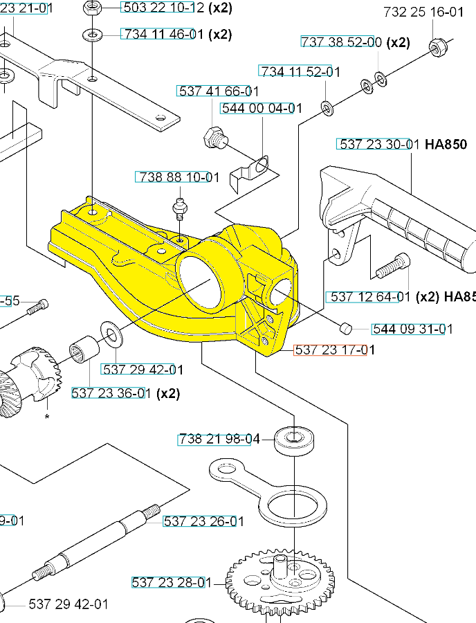 Obudowa przekładni dedykowana do nożyc Husqvarna. Produkt występuje pod numerem katalogowym: 537231701. Dokładne umiejscowienie obudowy widoczne na załączonym schemacie. Producent Husqvarna.