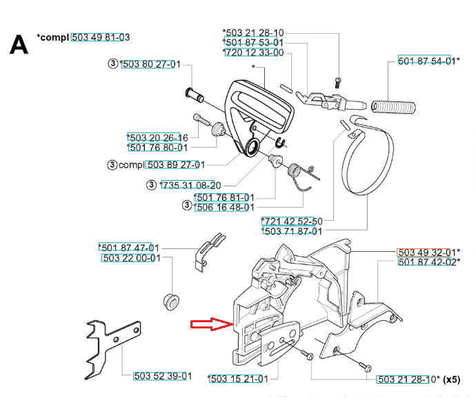 Oryginalna obudowa sprzęgła do pilarek spalinowych marki Husqvarna. Poszczególne elementy wchodzące w zestaw osłony sprzęgła widoczne na schemacie. Producent Husqvarna. Numer katalogowy: 503493201.