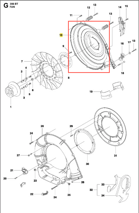 Obudowa wentylatora dmuchawy 356BTx Husqvarna - wysokiej jakości oryginalna część producenta Husqvarna. Aktualny numer katalogowy produktu: 544283701. Szczegóły montażu dostępne w załączonym schemacie. Poniżej znajduje się lista modeli, w których ten element jest wykorzystywany.