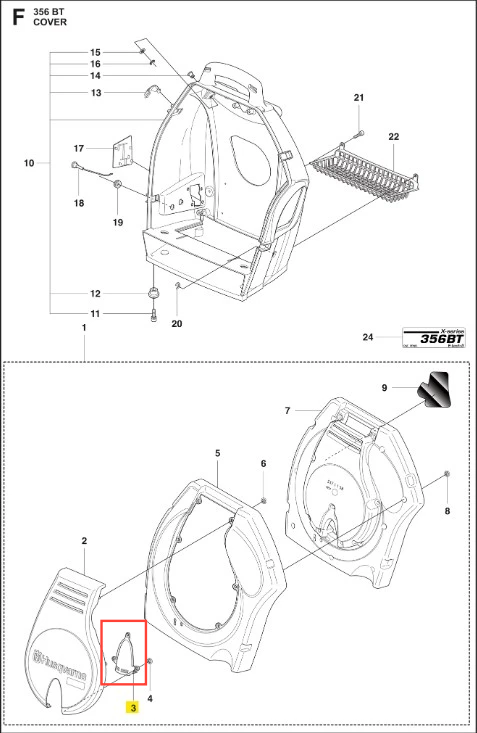 Osłona wylotu dmuchawy 356BTx Husqvarna - wysokiej jakości oryginalna część producenta Husqvarna. Aktualny numer katalogowy produktu: 537222001. Szczegóły montażu dostępne w załączonym schemacie. Poniżej znajduje się lista modeli, w których ten element jest wykorzystywany.