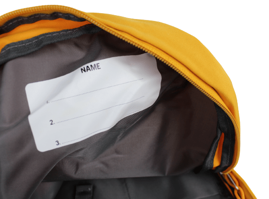 - Plakietka na imię umieszczona w środku plecaka