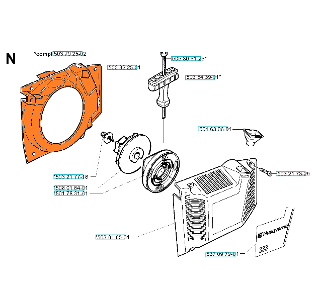 Wysokiej jakości pokrywa rozrusznika przeznaczona do pilarek spalinowych, producent Husqvarna. Oryginalny numer katalogowy: 503822503. Pokrywa umiejscowiona jest przy obudowie rozrusznika.
