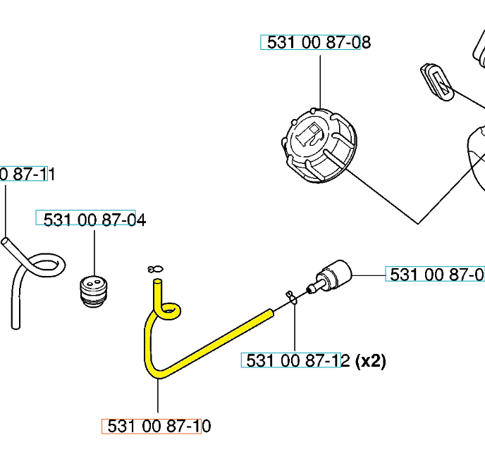 Przewód paliwowy dedykowany do nożyc, wykaszarek i podkaszarek Husqvarna. Produkt występuje pod numerem katalogowym: 531008710. Dokładne umiejscowienie przewodu widoczne na załączonym schemacie. Producent Husqvarna.