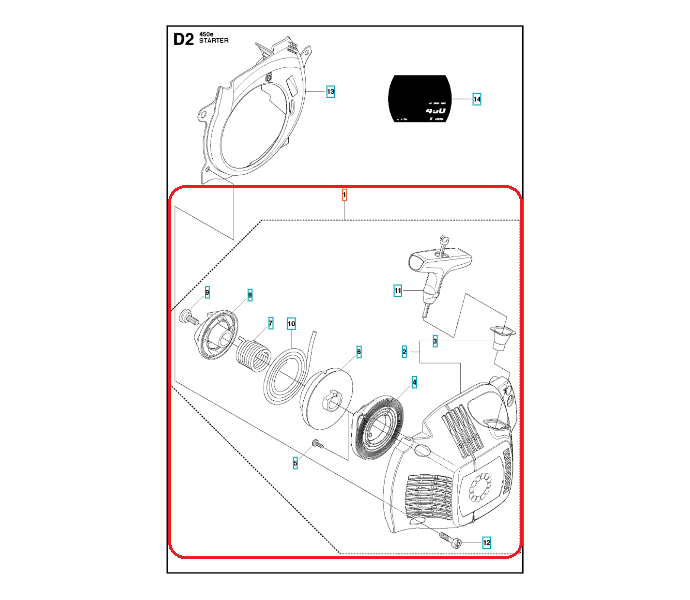 Oryginalny rozrusznik do pilarek spalinowych marki Husqvarna. Poszczególne elementy wchodzące w zestaw rozrusznika widoczne na schemacie. Numer katalogowy: 544158502.