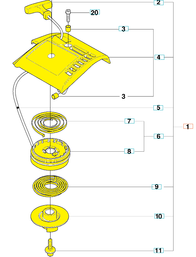 Rozrusznik dedykowany do nożyc Husqvarna. Produkt występuje pod numerem katalogowym: 576469601. Dokładne wskazanie elementów wchodzących w zestaw rozrusznika widoczne na załączonym schemacie. Producent Husqvarna.