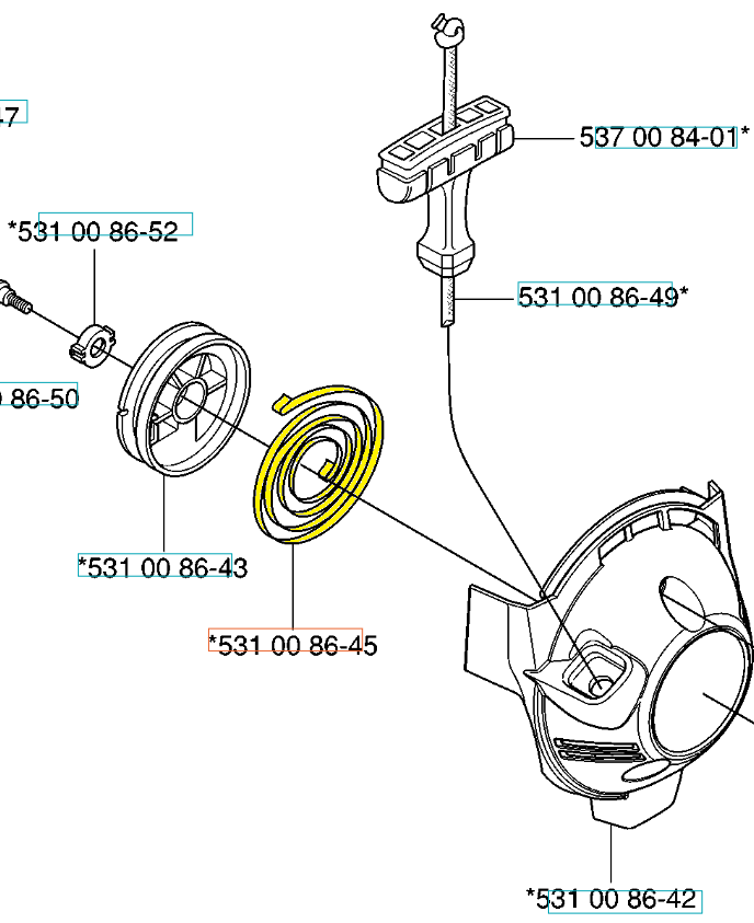 Sprężyna rozrusznika dedykowana do nożyc, wykaszarek i podkaszarek Husqvarna. Produkt występuje pod numerem katalogowym: 531008645. Dokładne umiejscowienie sprężyny widoczne na załączonym schemacie. Producent Husqvarna.