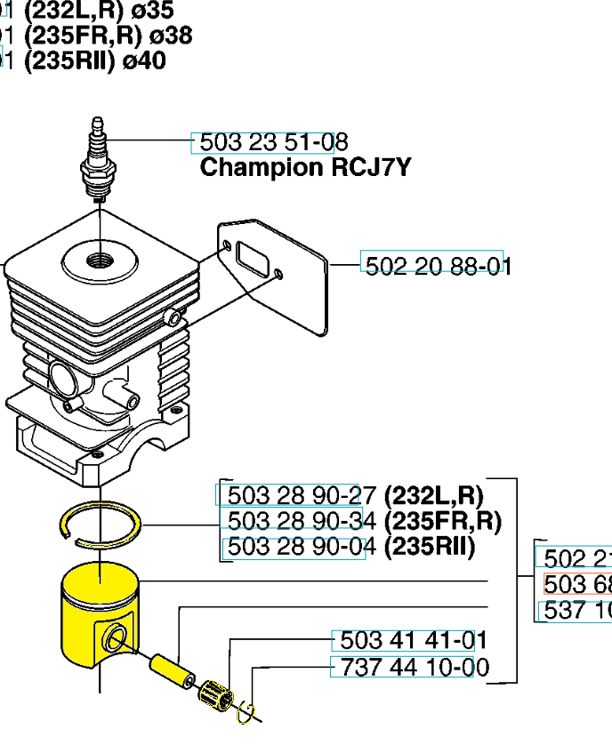 Husqvarna: 235R (19940600001-19954500000, 19954500001-19970500000, 19970500001-19980100000, 19980100001-20001400000, 20001400001-20023500000, 20023500001-20060100000, 20060100001-20061400000, 20061400001-20070100000, 20070100001-Current, 20144800001-current), 235FR (20070100001-20091800000, 20091800001-Current).