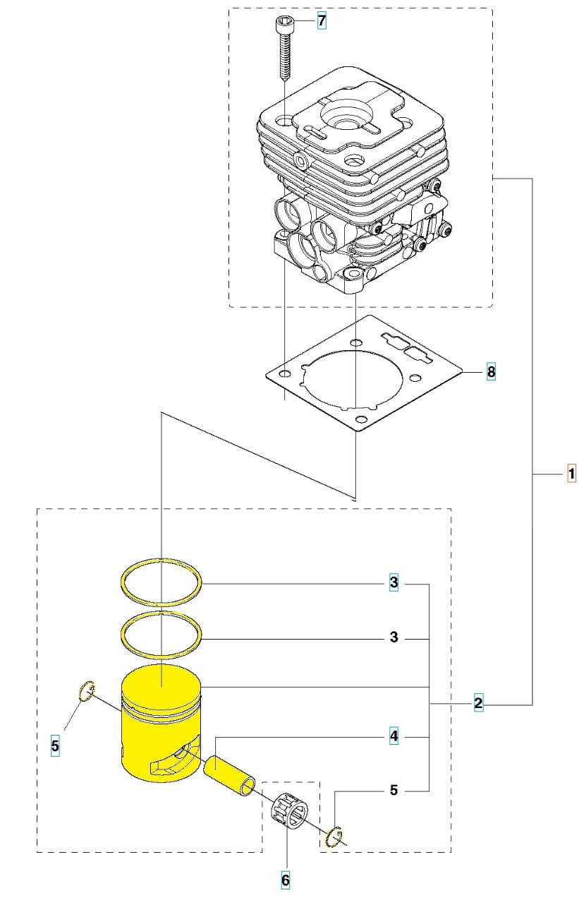 Zespół tłoka dedykowany do wykaszarek Husqvarna. Pierścień o średnicy 38 mm. Produkt występuje pod numerem katalogowym: 585998301. Dokładne wskazanie tłoka i elementów wchodzących w zestaw widoczne na załączonym schemacie. Producent Husqvarna.