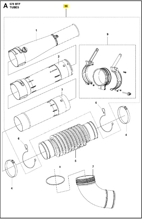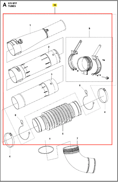 Zespół rury dmuchawy 578BTF Husqvarna - wysokiej jakości oryginalna część producenta Husqvarna. Aktualny numer katalogowy produktu: 596397201. Szczegóły montażu dostępne w załączonym schemacie. Aby uzyskać pełną listę modeli, do których pasuje ta część zamienna, prosimy o kontakt.