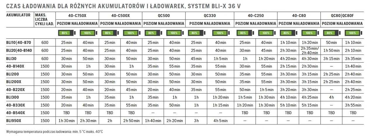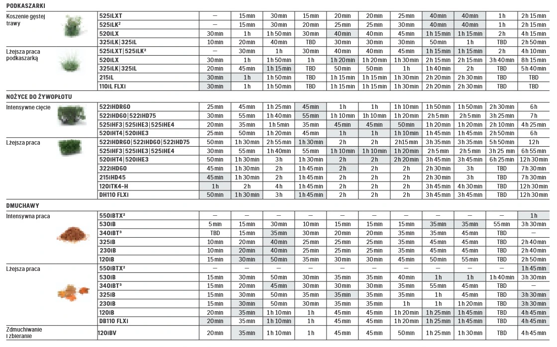 Czas pracy akumulatora uzależniony od rodzaju maszyny i rodzaju wykonywanej pracy: 15 min - 200 min,