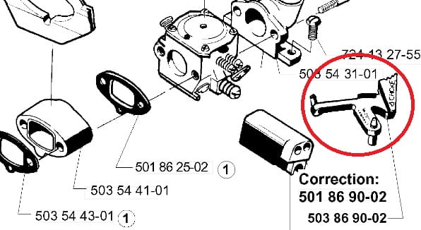 Producent Husqvarna, nr katalogowy: 501869002, 5018690-02, 501 86 90-02, 501869001, 5018690-01, 501 86 90-01. Dźwignia ssania ma za zadanie zamknąć przepływ powietrza w gaźniku.