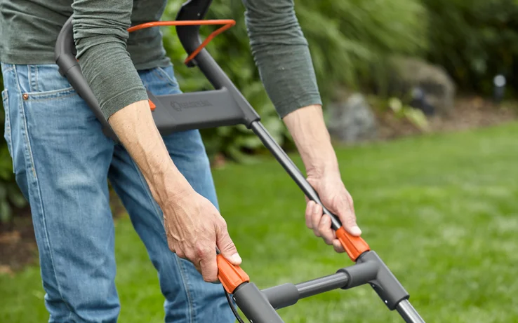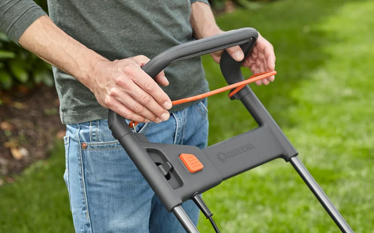 Ergonomiczny uchwyt w kształcie pałąka z dźwigniami po obu stronach pozwala wygodnie prowadzić kosiarkę niezależnie od pozycji dłoni. Teleskopowy trzonek umożliwia dopasowanie wysokości do wzrostu użytkownika, a składana konstrukcja ułatwia transport i przechowywanie.