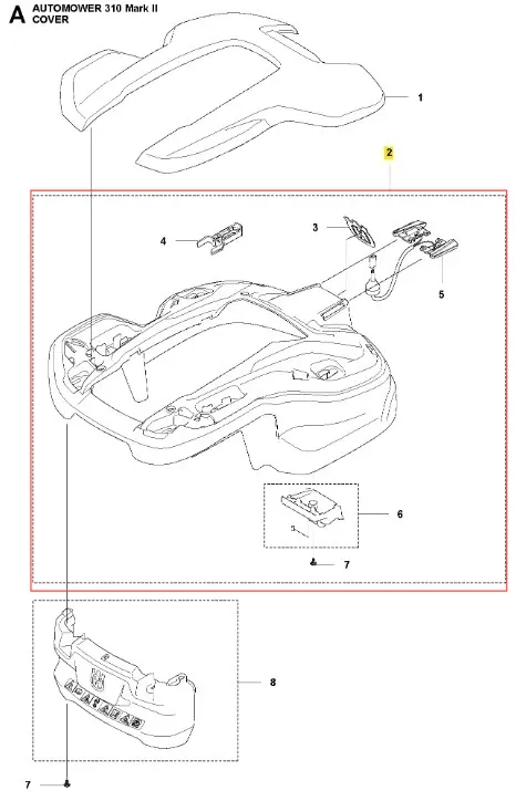 Oryginalna część Husqvarna – obudowa robota koszącego Automower 310 Mark II Husqvarna. Wykonana z wysokiej jakości materiałów, zapewnia niezawodność działania. Numer katalogowy: 597757602. Szczegóły dotyczące montażu zawarte są w schemacie. Poniżej znajduje się lista modeli, w których ten element jest również wykorzystywany.