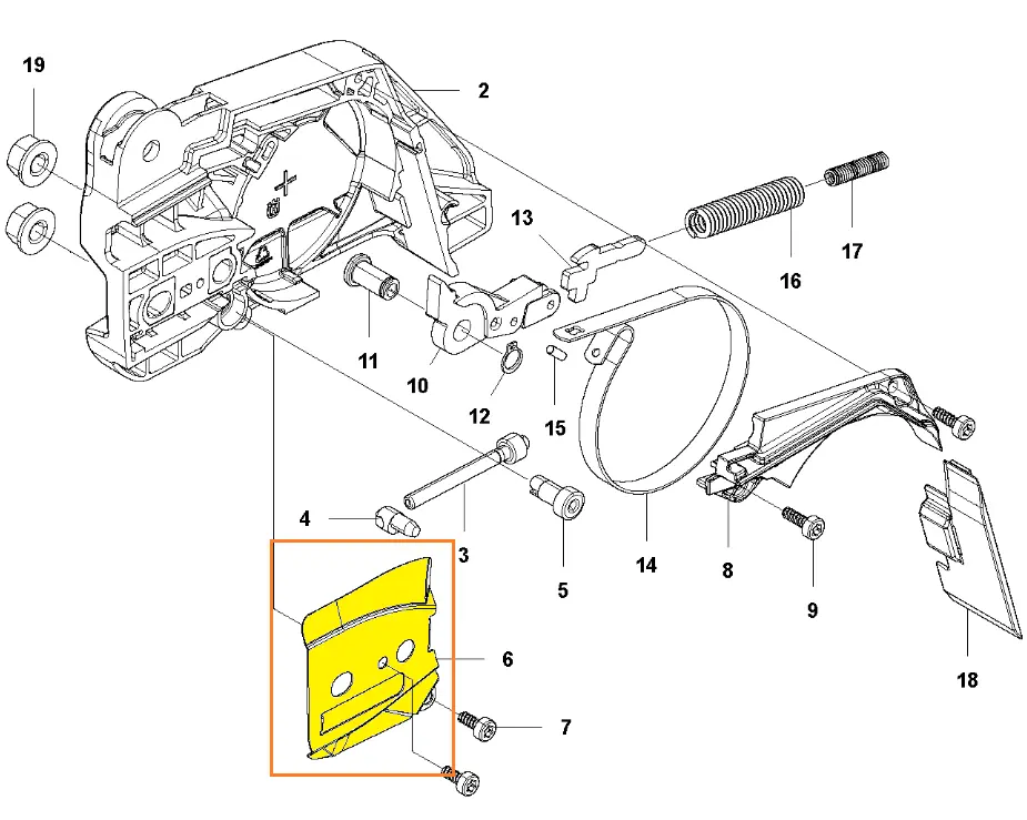 Oryginalna osłona karteru pełni rolę wewnętrznej płytki konstrukcyjnej lub montażowej w układzie sprzęgła i hamulca łańcucha w pilarkach Husqvarna 543 XP / 543 XPG. Wykonana z trwałego materiału gwarantuje stabilność konstrukcji, właściwe zamocowanie elementów i prawidłowe funkcjonowanie mechanizmu.
