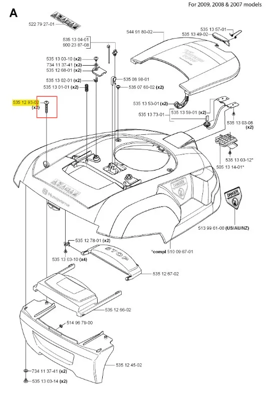 Śruba robota koszącego Automower 220 AC Husqvarna - oryginalny element firmy Husqvarna. Charakteryzuje się wysoką jakością i trwałością. Numer katalogowy: 535129302. Dokładne informacje o montażu znajdziesz w załączonym schemacie. Poniżej znajduje się lista modeli, w których ten element jest również wykorzystywany.