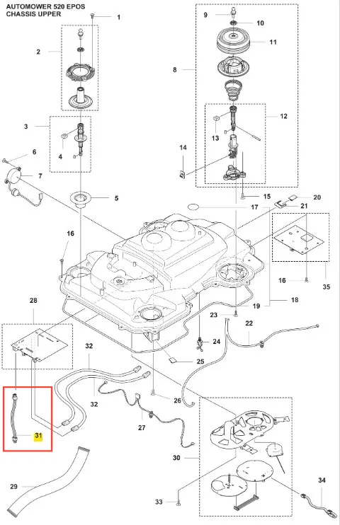 Wiązka robota koszącego Automower 520 EPOS Husqvarna - oryginalna część producenta, wykonana z wysokiej jakości materiałów. Aktualny numer katalogowy: 591203102. Instrukcje montażowe znajdują się w schemacie. Poniżej znajduje się lista modeli, w których ten element jest również wykorzystywany.