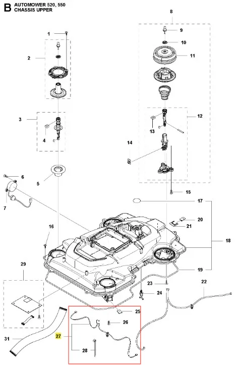 Oryginalna część Husqvarna – wiązka robota koszącego Automower 550 Husqvarna. Wykonana z wysokiej jakości materiałów, zapewnia niezawodność działania. Numer katalogowy: 581621101. Szczegóły dotyczące montażu zawarte są w schemacie. Poniżej znajduje się lista modeli, w których ten element jest również wykorzystywany.
