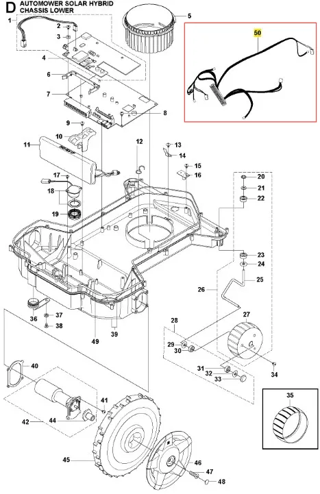 Wiązka robota koszącego Automower Solar Hybrid Husqvarna - oryginalna część producenta, wykonana z wysokiej jakości materiałów. Aktualny numer katalogowy: 501003703. Instrukcje montażowe znajdują się w schemacie. Poniżej znajduje się lista modeli, w których ten element jest również wykorzystywany.