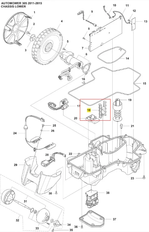 Wspornik robota koszącego Automower 305 Husqvarna - oryginalna część producenta, wykonana z wysokiej jakości materiałów. Aktualny numer katalogowy: 574501901. Instrukcje montażowe znajdują się w schemacie. Poniżej znajduje się lista modeli, w których ten element jest również wykorzystywany.