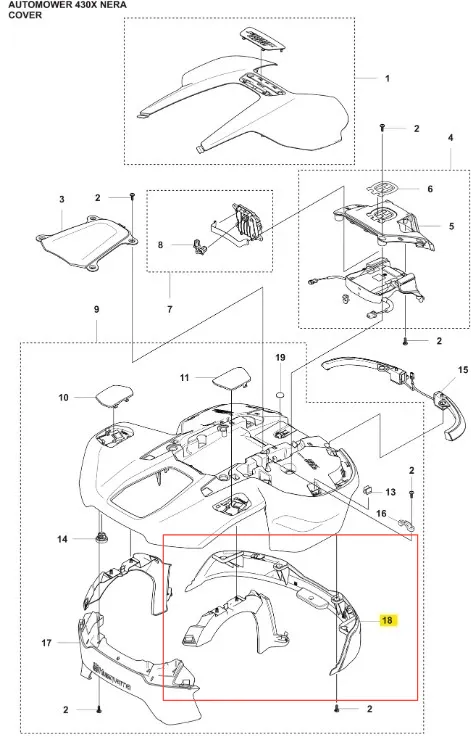 Zderzak przód robota koszącego Automower 430X NERA z technologią bezprzewodową Husqvarna - wysokiej jakości oryginalna część producenta Husqvarna. Aktualny numer katalogowy produktu: 531256401. Szczegóły montażu dostępne w załączonym schemacie. Poniżej znajduje się lista modeli, w których ten element jest również wykorzystywany.
