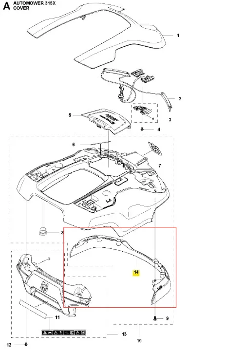 Zderzak robota koszącego AUTOMOWER 315X Husqvarna - oryginalna część producenta, wykonana z wysokiej jakości materiałów. Aktualny numer katalogowy: 589337001. Instrukcje montażowe znajdują się w schemacie. Poniżej znajduje się lista modeli, w których ten element jest również wykorzystywany.