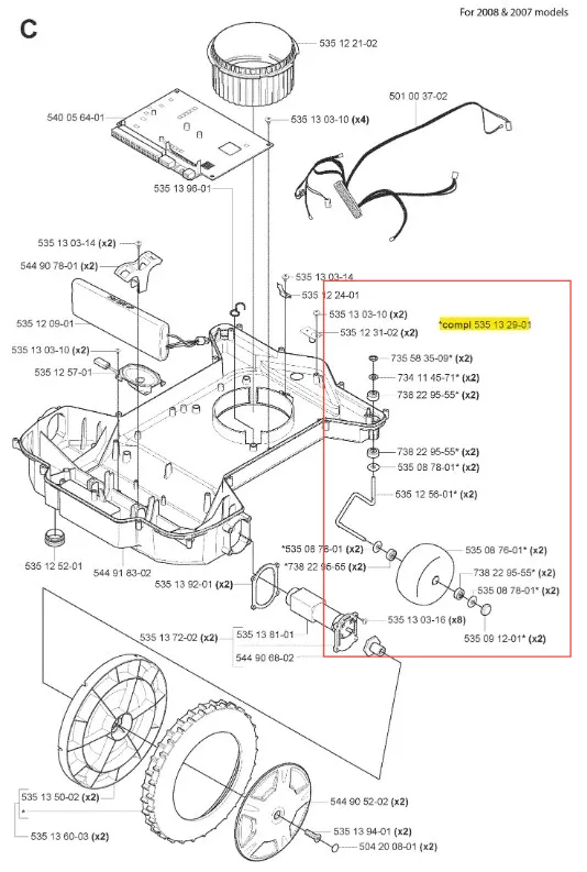 Oryginalna część Husqvarna – zestaw koła robota koszącego Automower 220 AC Husqvarna. Wykonana z wysokiej jakości materiałów, zapewnia niezawodność działania. Numer katalogowy: 535132901. Szczegóły dotyczące montażu zawarte są w schemacie. Poniżej znajduje się lista modeli, w których ten element jest również wykorzystywany.